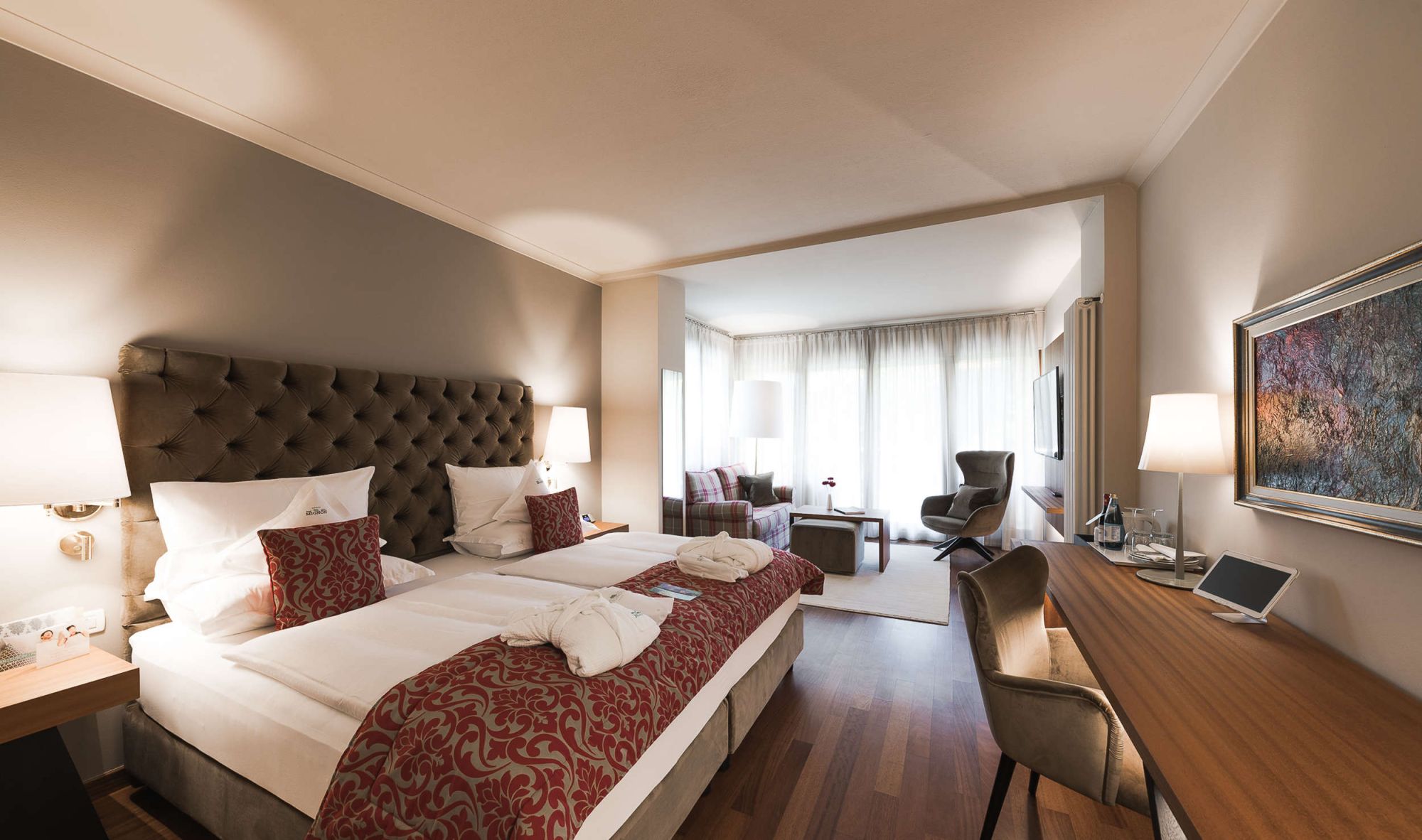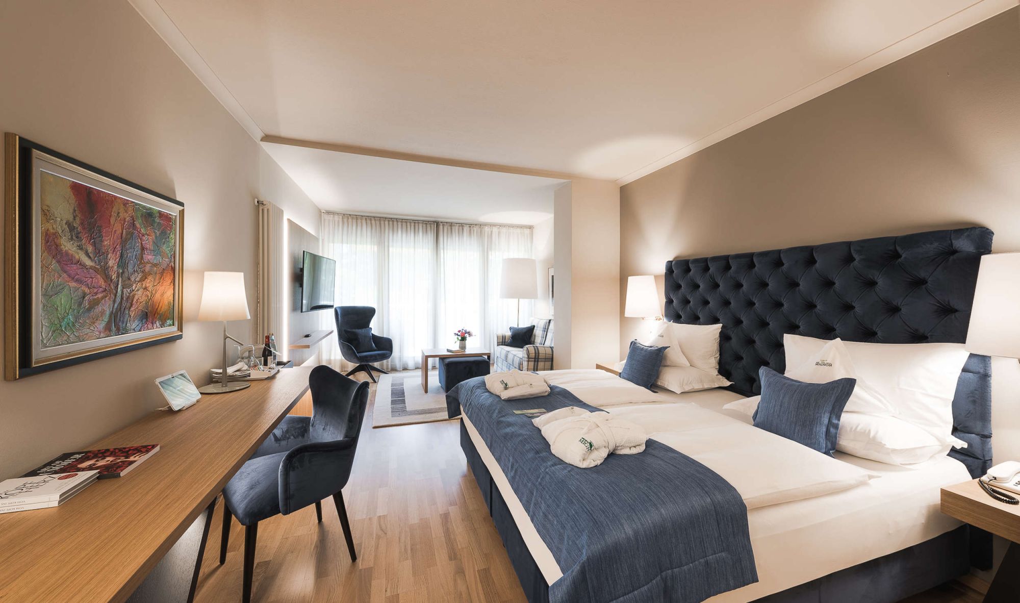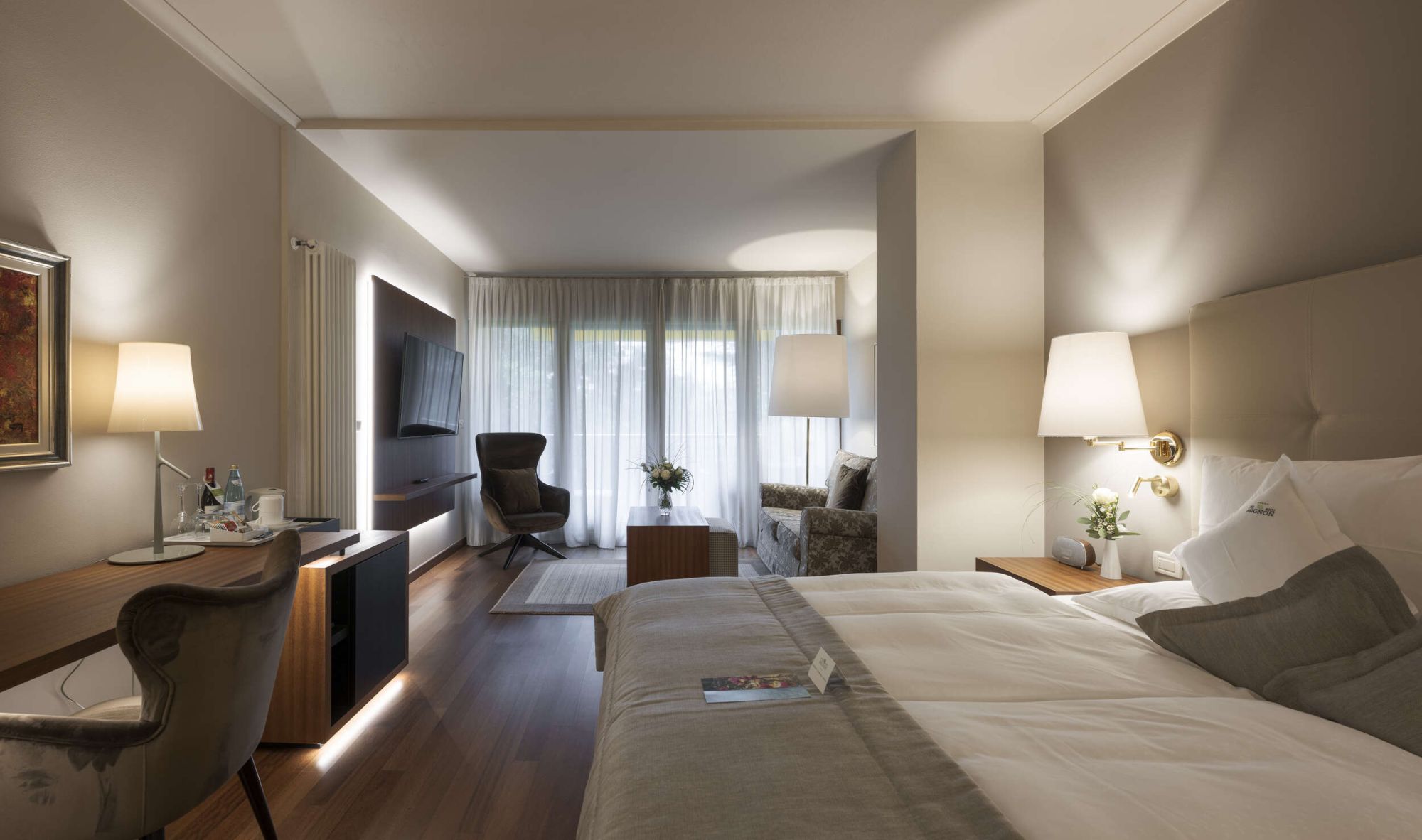 Letto king-size con materasso memory foam| ampio balcone terrazza con vista parco |Pavimento in legno | doppio lavabo |doccia | alcune con vasca da bagno | bidet | asciugacapelli |specchio per il trucco |esclusivi prodotti da bagno L'Occitaneà | zona giorno | TV a schermo piatto | WiFi | telefono | radio | aria condizionata | cassaforte in camera |bollitore con selezione di tè | minibar | zaino da trekking | mele altoatesine come regalo di benvenuto | fiori freschi del nostro giardino | dolcetti Loacker