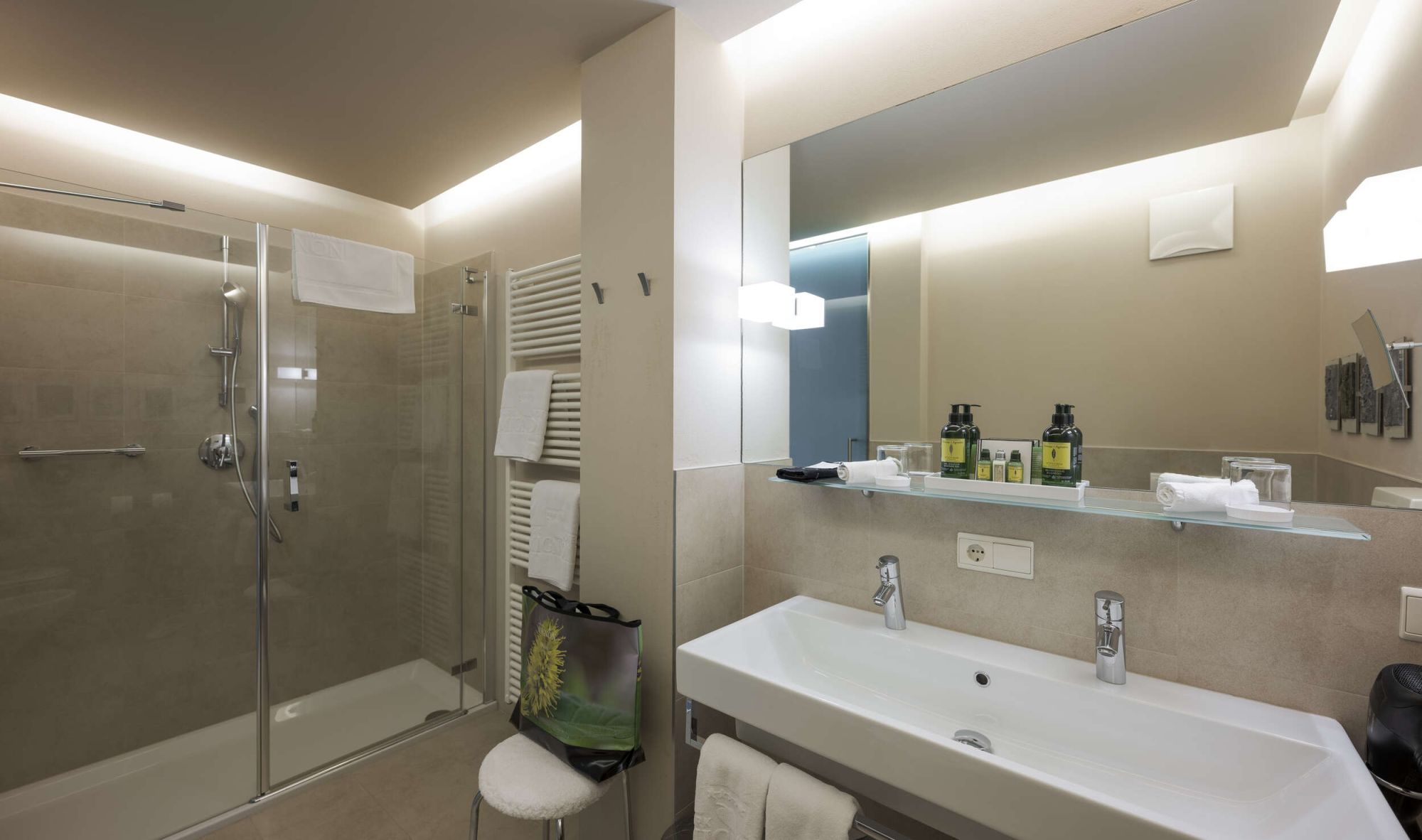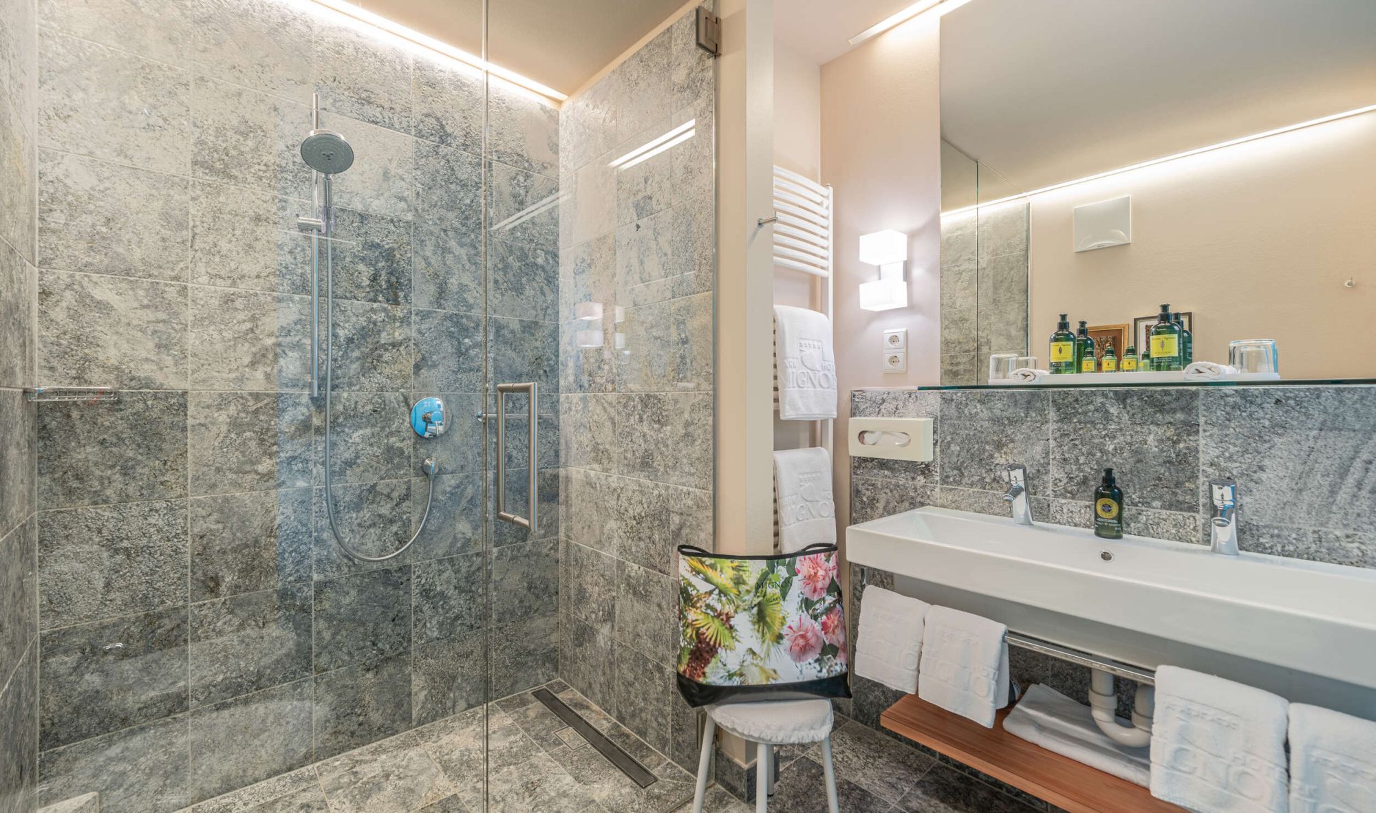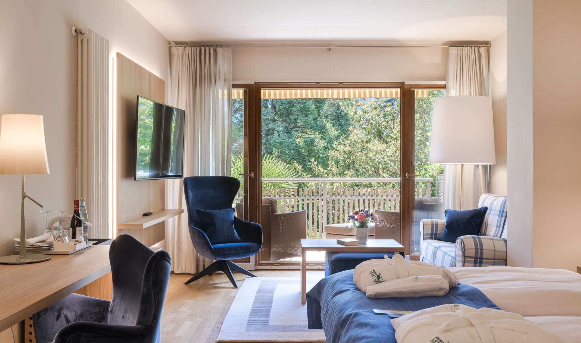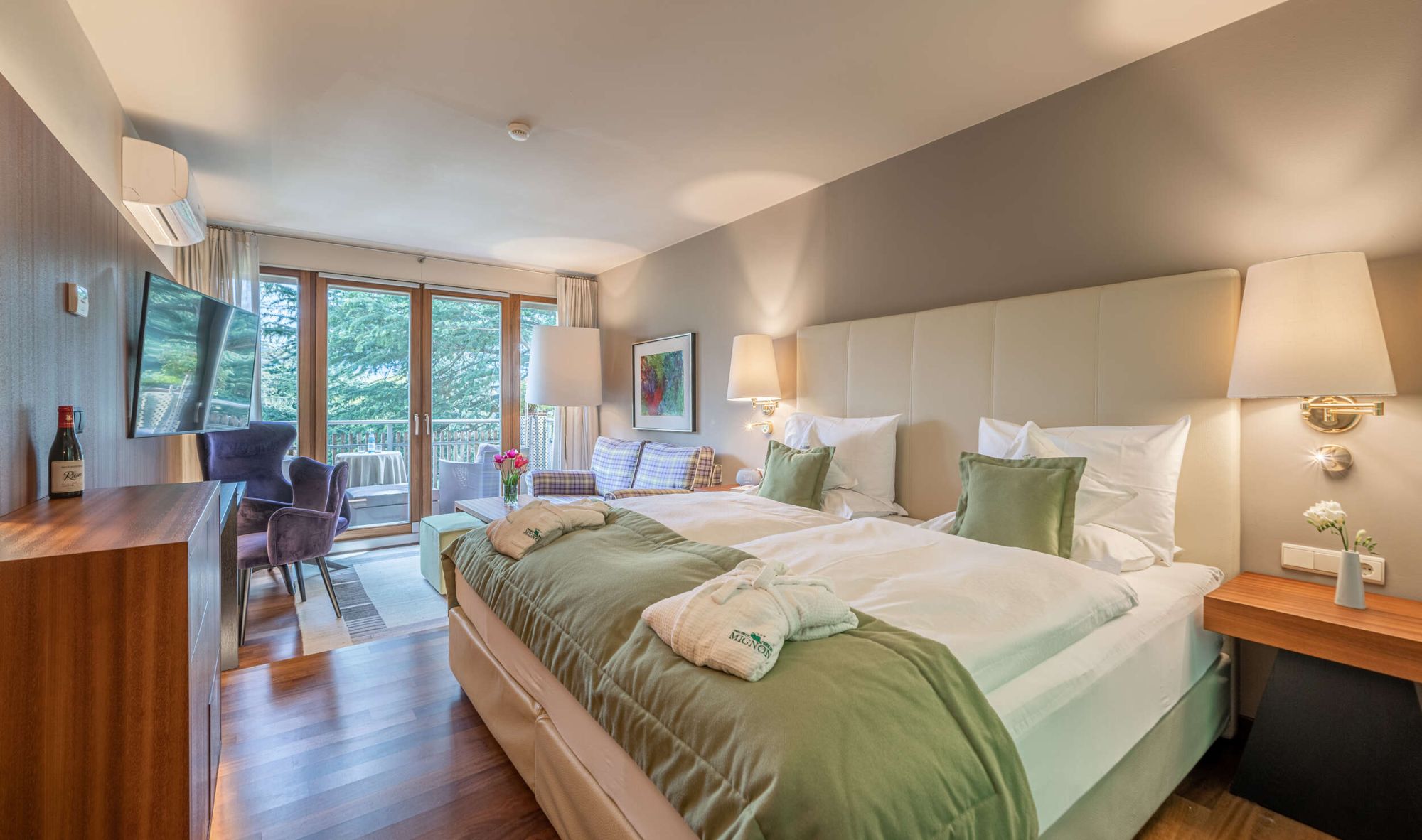 Letto king-size con materasso memory foam| ampio balcone terrazza con vista parco |Pavimento in legno | doppio lavabo |doccia | alcune con vasca da bagno | bidet | asciugacapelli |specchio per il trucco |esclusivi prodotti da bagno L'Occitaneà | zona giorno | TV a schermo piatto | WiFi | telefono | radio | aria condizionata | cassaforte in camera |bollitore con selezione di tè | minibar | zaino da trekking | mele altoatesine come regalo di benvenuto | fiori freschi del nostro giardino | dolcetti Loacker